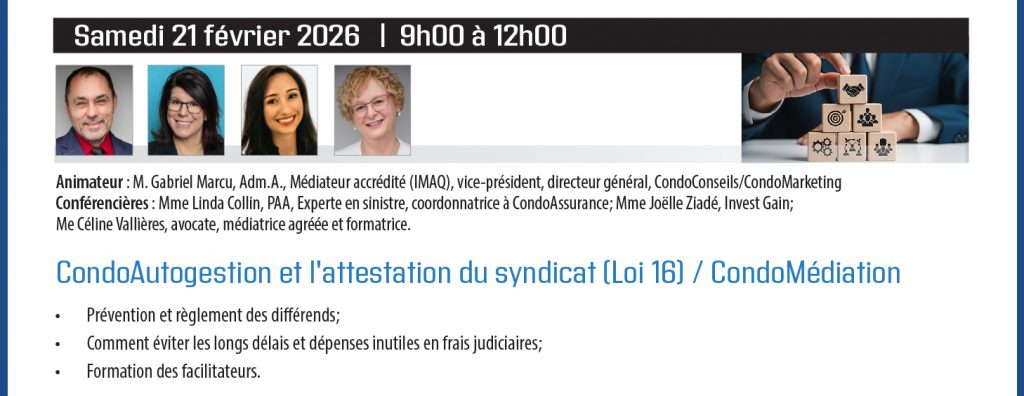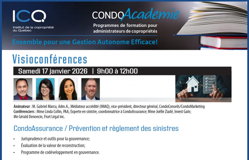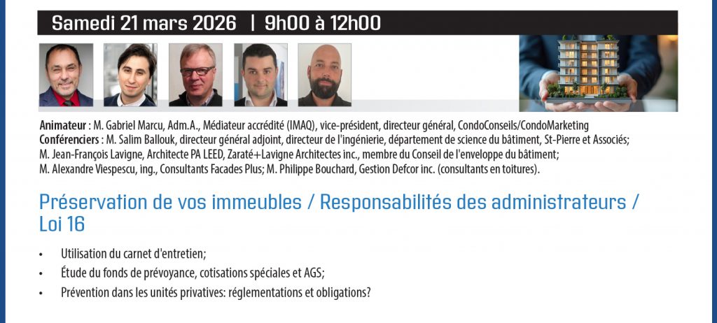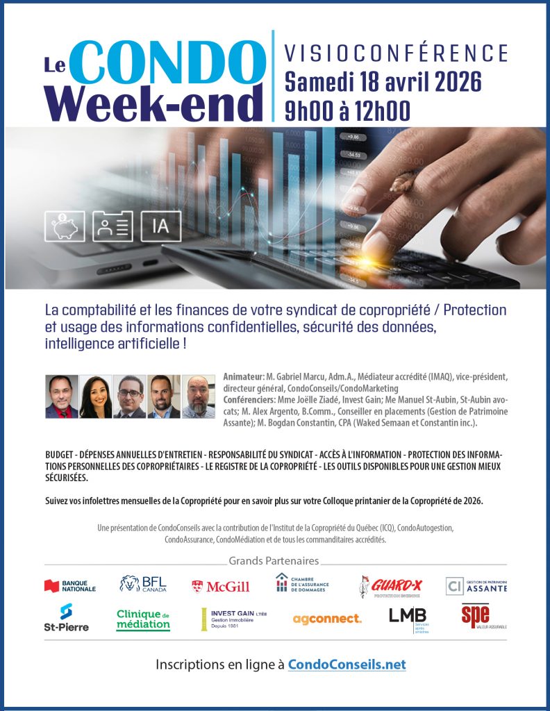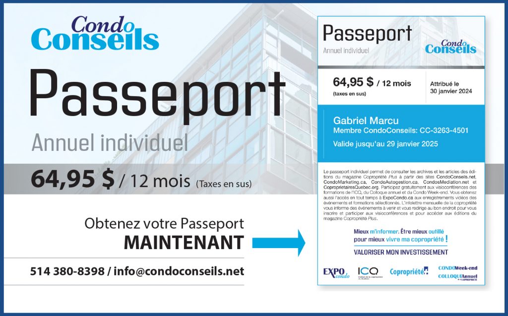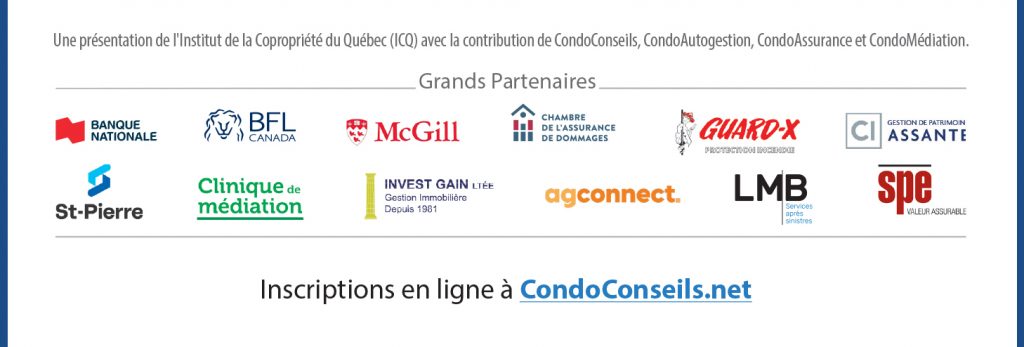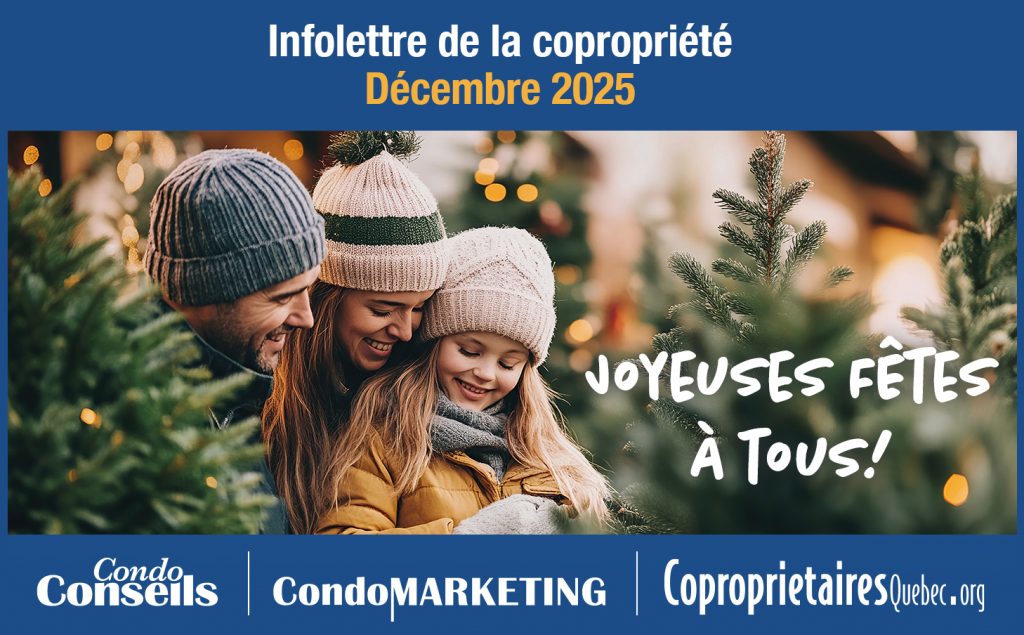 L'infolettre mensuelle de la copropriété est distribuée le 1er de chaque mois. Elle est dédiée au grand public et à tous ceux qui choisissent et recherchent des solutions pour vivre en harmonie tout en créant de la valeur pour leur copropriété. L'infolettre permet à CondoConseils et à l'Institut de la copropriété du Québec de vous informer sur les événements et formations à venir. On vous propose des articles publiés dans le magazine Copropriété Plus et des informations utiles pour vous aider dans la gestion de vos copropriétés. Les administrateurs des syndicats de copropriété membres de CondoConseils, les représentants des commanditaires accrédités et le public peuvent recevoir l'infolettre mensuellement. Pour recevoir l'infolettre, inscrivez-vous gratuitement à: