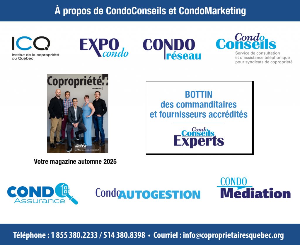 L'infolettre mensuelle de la copropriété est distribuée les 1ers de chaque mois. Elle est dédiée au grand public et à tous ceux qui choisissent et recherche des solutions pour vivre en harmonie tout en créant de la valeur pour leur copropriété. L'infolettre permet à CondoConseils et à l'Institut de la copropriété du Québec de vous informer sur les événements et formations à venir. Elle propose aux membres des articles en vedettes publiés dans le magazine Copropriété Plus et vous partage des nouvelles importantes pour la bonne gestion de vos copropriétés. Tous les administrateurs des syndicats de copropriété membres de CondoConseils et les représentants des fournisseurs accrédités reçoivent l'infolettre mensuellement.